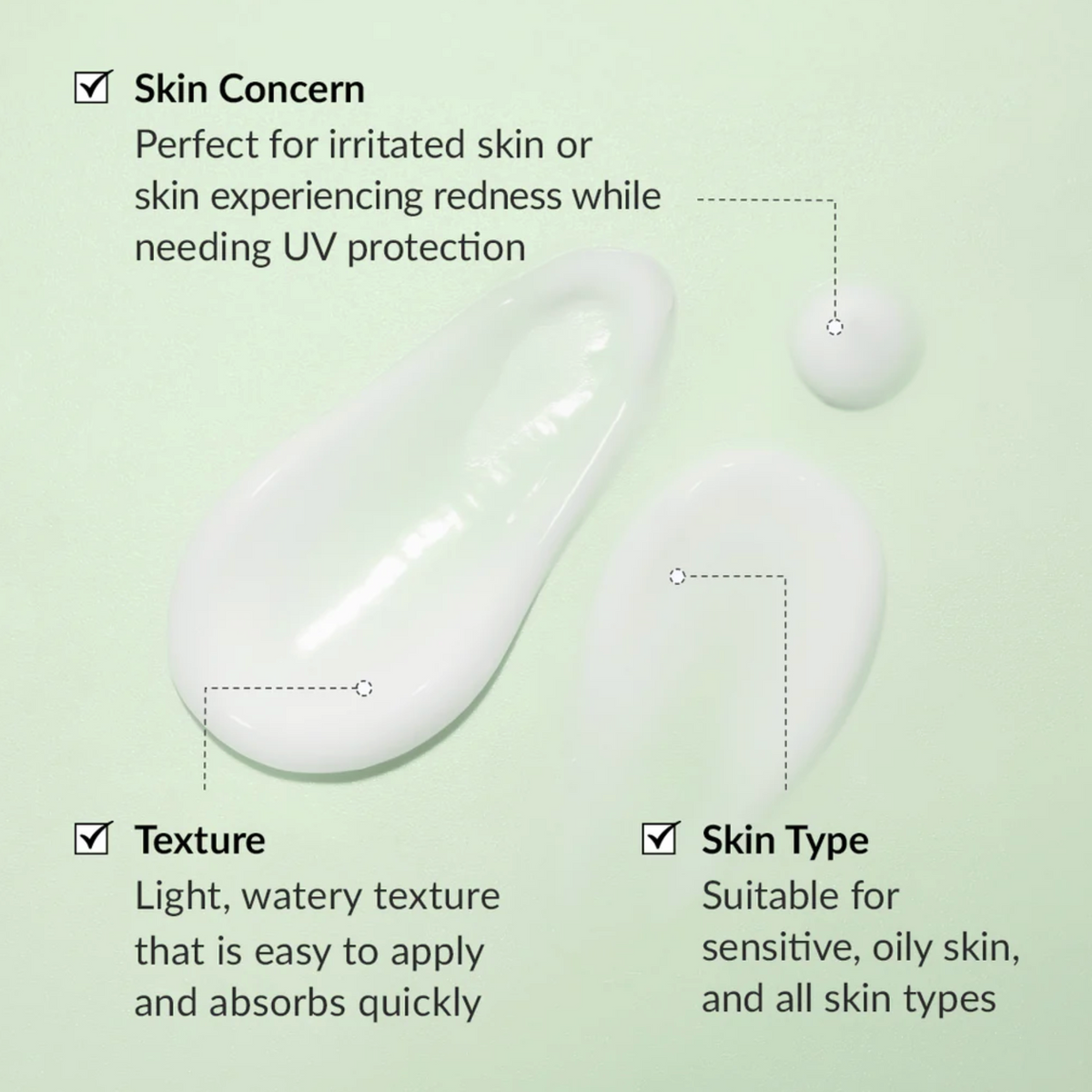 With its lightweight, watery texture, it glides on effortlessly and absorbs seamlessly, making it ideal for sensitive, redness-prone skin in need of UV protection.